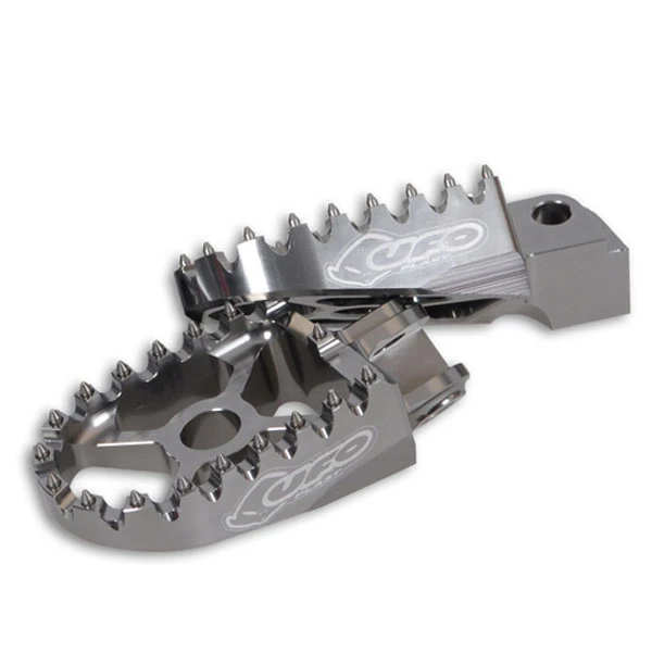 Pedane poggiapiedi in alluminio interamente ricavate con lavorazione CNC dal pieno. Robuste e leggerissime, le pedane UFO offrono il massimo grip alla suola di ogni stivale. I denti sono intercambiabili